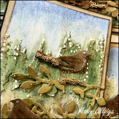 Dessa ATC har tekniken stencil och tema fåglar. Jag har använt mig av en hel del olika cardstock men framför allt Craft, akrylfärger från Martha Stewart, tjocka medium från Prima Marketing, glitter från Stickles och distressdynor från Ranger/Tim Holtz. Jag har geggat, kletat och duttat i massor som ni ser. ;)